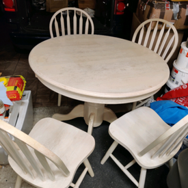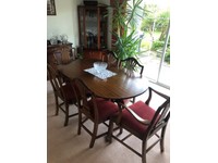 All in very good condition. Restored dining suite including 6 cantilevered chrome dining chairs with black vinyl upholstery and matching chrome table with smoked glass table top. The vineyard white rustic dining table has an oak top and is paired the plain and simple white legs to compliment the natural wood knots at the tabletop. Solid 8 seater dining table with 8 chairs (only six in picture as two are in storage) in good condition. Shabby chic dining table and chairs.